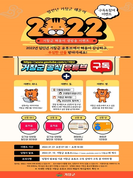 특히 이번 해맞이 생중계에는 각종 이벤트가 풍성하게 마련되어 있다. 생중계가 진행되는 동안 실시간 채팅이나 댓글로 신년인사를 남기거나, 올 한 해 동안 수고한 소상공인들과 거창군민들에게 응원의 메시지를 남기면 추첨을 통해 소정의 선물을 증정한다. 이외에도 거창군 3행시 짓기, 거창군 유튜브에서 보고 싶은 콘텐츠 추천 등 다양한 이벤트가 준비돼 있다.