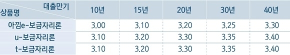 또 전자약정 등 온라인으로 신청해 비용을 절감할 수 있는 ‘아낌e-보금자리론’은 이보다 0.10%p 낮은 연 3.00%(만기 10년)에서 최대 3.30%(40년)의 금리가 적용된다.