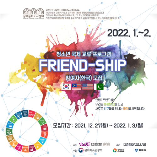 김해문화재단 문화도시센터는 청소년 국제교류 프로그램 ‘프렌드-쉽(FRIEND-SHIP)’의 참가자를 오는 1월 3일까지 모집한다. 대상은 김해에 거주하는 중·고등학생이며 모집 규모는 총 10명이다.