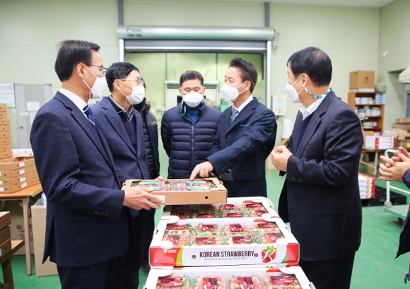 경남농협 김주양 신임본부장이 29일 김해 한림농협 산지유통센터를 방문해 겨울딸기 주 출하 시기에 내수 및 수출 선별현장을 방문해 농업인과 관계자들의 노고를 격려했다.