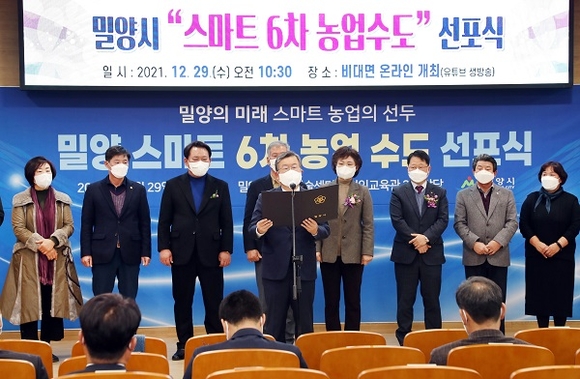 경남 밀양시는 29일 농업기술센터 농업인교육관에서 스마트 6차 농업 중심지로의 도약을 다짐하는 '스마트 6차 농업수도 밀양 선포식'을 비대면(유튜브 생방송)으로 개최했다.