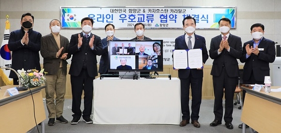 경남 함양군은 지난 28일 군청 소회의실에서 카자흐스탄 카라탈군과 온라인 우호교류 협약을 체결하고 상생 발전을 위한 협력을 약속했다.