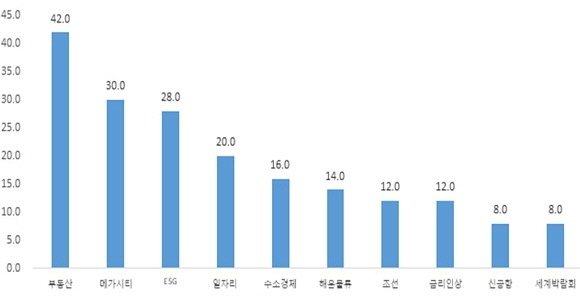 아울러 위 연구보고서는 내년도 동남권 경제 10대 키워드 전망도 조사했다. 그 결과 ‘부동산’이 다시 1위를 차지했으며 이어 2위부터 ▲메가시티 ▲ESG ▲일자리 ▲수소경제 ▲해운물류 ▲조선 ▲금리 인상 ▲신공항 ▲세계박람회 순으로 관심도가 클 것으로 전망했다.
