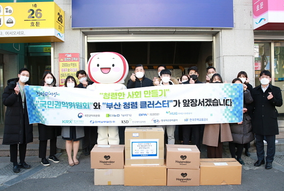 캠페인 참여 기관들은 부산진시장 상인회에 부패방지 안내 리플릿 1000장과 함께 손 소독 티슈 600개, 마스크 500대, 핫팩 500개, 우산 100개를 전달하며 청렴 의지를 다졌다.