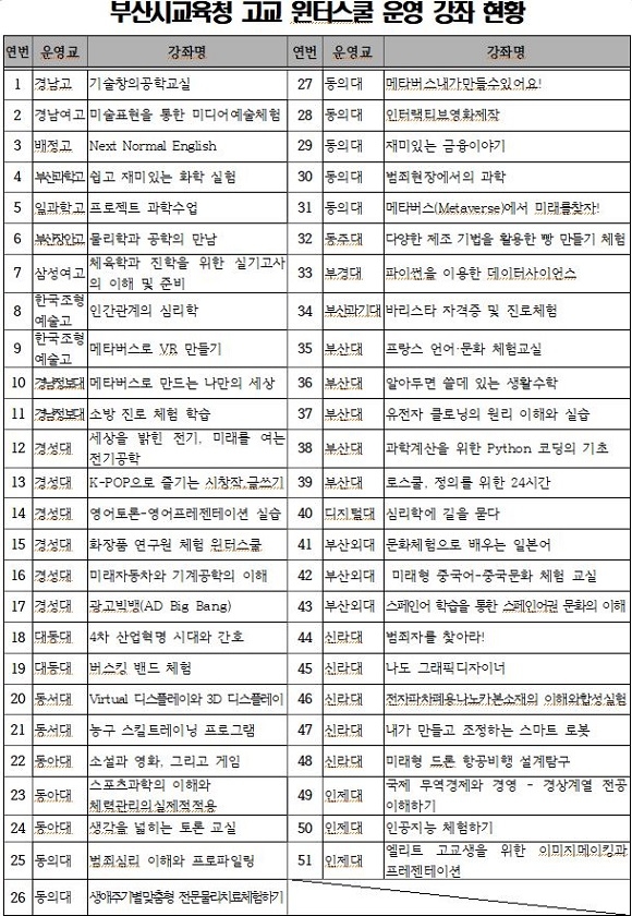 부산시교육청이 겨울방학 기간인 오늘(3일)부터 오는 15일까지 일반고 1~2학년 학생을 대상으로 부산 소재 고등학교 8개교와 대학 14개교에서 ‘고교 윈터스쿨’을 운영한다고 밝혔다.
