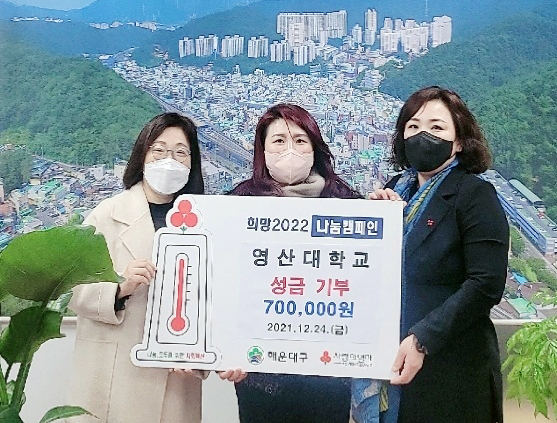 영산대학교 미용건강관리전공이 지난달 24일 부산 해운대구 반송2동 행정복지센터를 방문해 성금 70만원을 전달했다. 성금은 미용건강관리전공 교수와 재학생들이 모금한 것이다.