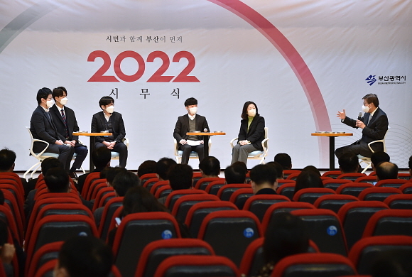 이어 새해를 맞아 부산 시정에 바라는 시민의 인터뷰를 담은 영상을 상영했다. 이러한 시민 의견을 바탕으로 박 시장과 직원이 ▲15분 도시 정책 ▲코로나19 ▲2022 부산 경제 ▲2030 세계박람회 ▲조직 문화 등 현안을 주제로 ‘새해 희망토크’ 프로그램을 진행했다.