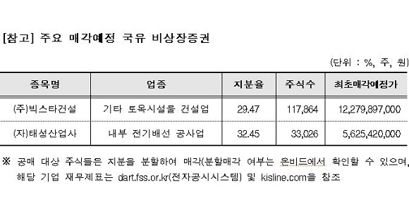 이번 비상장증권 매각 입찰은 매각예정가의 100%를 시작으로 총 네 차례에 걸쳐 진행된다. 2회 유찰된 종목의 경우 3회부터 매회 최초 매각예정가의 10%씩 단계적으로 줄여 입찰이 진행된다.