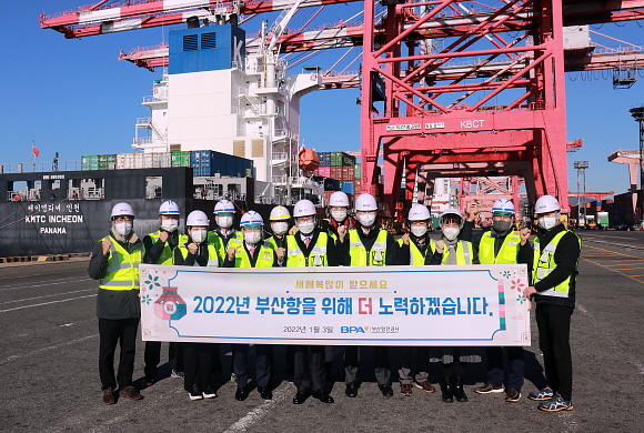 강준석 사장과 BPA 임원, 간부진은 시무식을 마친 이후 부산 북항 신선대 터미널 현장을 찾아 선박 하역 작업장에서 새해 포부를 다짐하며 올해 업무를 시작했다.