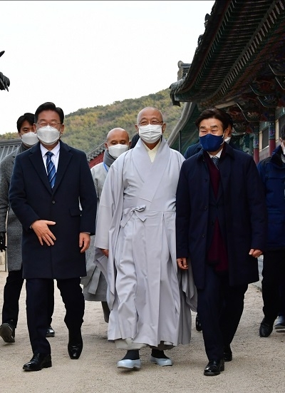 이날 김일권 시장은 통도사 경내에서 만난 이재명 대통령 후보에게 유네스코 세계문화유산인 통도사의 역사에 대해 안내하면서 지역사회와 문화재의 조화로운 가치에 대해서도 의견을 나눴다.