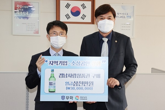 무학은 한 해 동안 고생한 직원을 격려하기 위해 코로나19 장기화로 특히 힘든 시기를 보내고 있는 도내 소상공인을 지원할 수 있는 법인 경남사랑상품권을 구매했다.