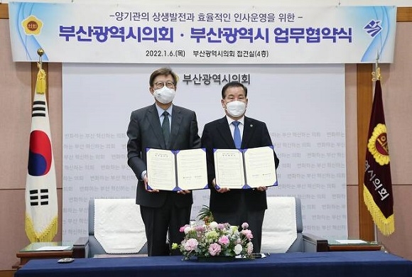 부산시의회와 부산시가 지난 6일 오전 시의회 접견실에서 ‘인사 분야 운영 교류 및 상호 협력’ 협약을 체결했다고 7일 밝혔다.