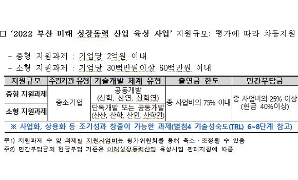 부산시가 지역 내 미래 성장동력 분야 중소기업의 경쟁력을 높이고 기술 혁신 역량 강화를 목표로 ‘2022 미래 성장동력 산업 육성사업’에 참여할 기업을 모집한다고 7일 공고했다.