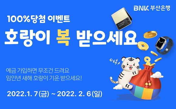 BNK부산은행이 임인년 새해를 맞아 오늘(7일)부터 내달 6일까지 ‘호랑이 복! 받으세요’ 예금 가입 경품 증정 이벤트를 진행한다고 안내했다.