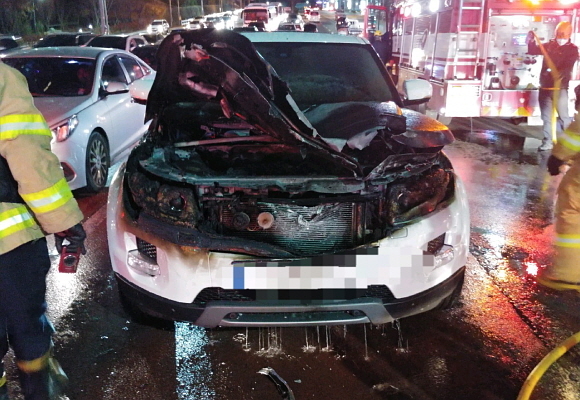 경찰에 따르면 운전자 A모(40대)씨가 운행 중인 레인지로버 차량이 당시 미남교차로에서 신호대기 중에 갑자기 엔진 부분에서 연기가 나며 불이 붙었다.