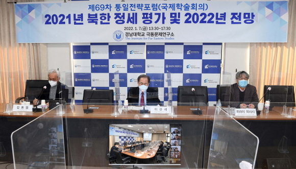 경남대학교 극동문제연구소는 7일 삼청동 극동문제연구소에서 제69차 통일전략포럼(웨비나, 동시통역)을 개최했다. ‘2021년 북한 정세 평가와 2022년 전망’을 주제로 열린 이번 포럼은 정치·군사·경제·대외·대남 총 5개의 세부 주제를 2개 세션으로 나눠 진행됐다.
