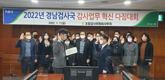 농협 경남검사국은 7일 지역본부 회의실에서, 농·축협을 대상으로 감사 업무를 하는 검사역 전원이 참석한 가운데 ‘2022년 감사업무 혁신 다짐대회’를 개최했다.