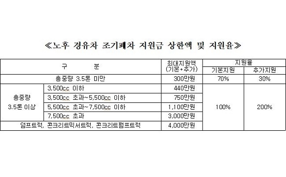 먼저 조기 폐차 보조금 지원 대상은 ‘자동차 배출가스 5등급 경유 자동차’ 또는 ‘2005년 이전 제작된 도로용 3종 건설기계(덤프트럭, 콘크리트 믹서 트럭, 콘크리트 펌프 트럭)’다.