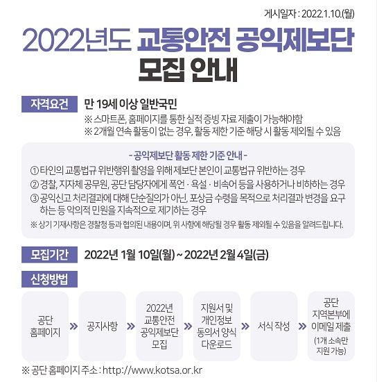 한편, 교통안전 공익제보단 신청은 공단 홈페이지에서 서류를 받아 이메일로 신청할 수 있다.