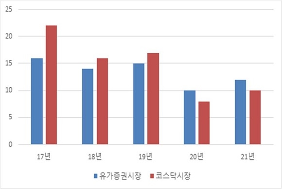 시장별로는 유가증권시장이 14개사로 전년대비 2개사가 늘었으며 코스닥시장은 23개사로 전년대비 6개사가 증가했다.
