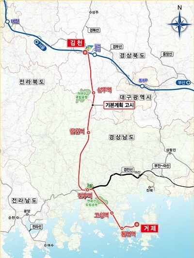 경북 김천에서 경남 거제까지 연결되는 총연장 177.9㎞에 총사업비 4조 8015억 원이 투자될 남부내륙철도의 기본계획 고시 내용에는 경남의 합천역, 고성역, 통영역, 거제역 4개 역을 신설하고, 진주역은 기존역을 활용한다.