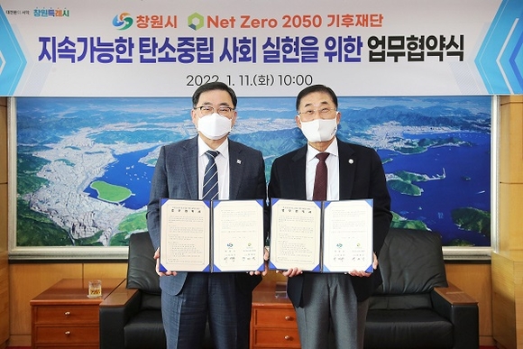 경남 창원시는 11일 오전 10시 접견실에서 외교부 소관 비영리법인인 '넷 제로 2050 기후재단'과 지속가능한 탄소중립사회 실현을 위한 업무협약을 가졌다.