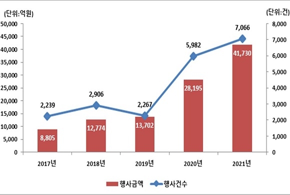 조사결과, 지난해 행사건수는 전년대비 18.1%(1084건) 늘어났으며 금액은 전년대비 48.0%(1조 3535억원) 증가한 것으로 집계됐다.