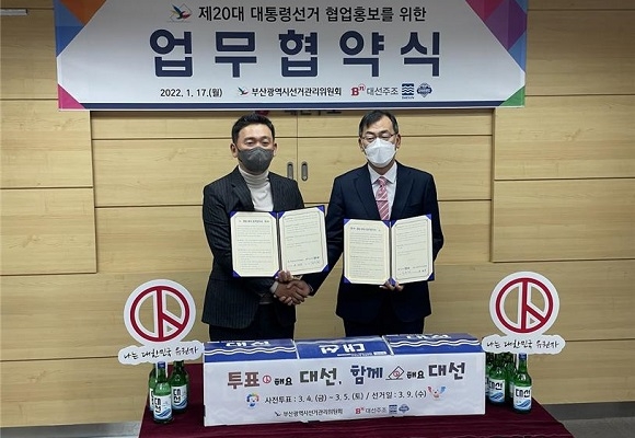 대선주조와 부산시선거관리위원회(부산시선관위)가 17일 대선주조 본사에서 ‘제20대 대통령 선거(대선) 홍보 협업’ 협약을 체결했다.