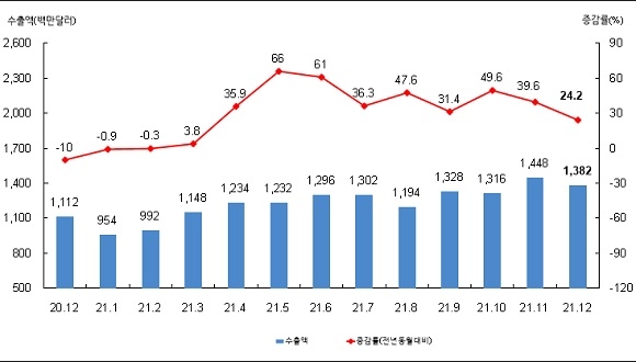지역별로는 EU(26억 8700만 달러)·중남미(11억 4100만 달러)·미국(21억 3000만 달러)·중국(20억 5100만 달러)·동남아(28억 9900만 달러)로의 수출이 각 95.8%, 53.8%, 26.0%, 14.6%, 53.8% 증가했다. 다만 일본으로의 연간 수출액은 지난해 11억 8800만 달러를 기록하며 전년대비 0.4% 감소한 것으로 나타났다.