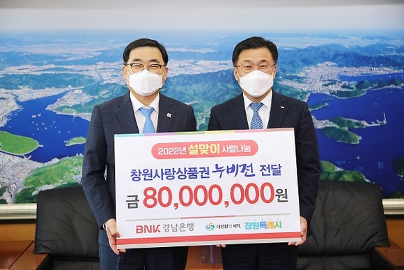 경남 창원시는 BNK경남은행이 17일 오후 3시 접견실에서 설을 맞아 창원사랑상품권(누비전) 8천만 원을 기탁했다고 밝혔다.