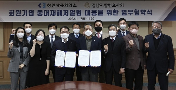 이날 협약은 오는 1월 27일 시행 예정인 ‘중대재해처벌법’과 관련하여 창원상공회의소 회원기업의 산업재해예방과 법률 구조활동을 통한 상공인의 권익보호 등을 지원하기 위해 마련됐다.