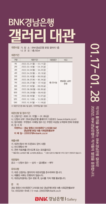 경남은행은 오는 28일까지 ‘2022년 BNK경남은행갤러리 대관’ 접수를 진행 중이라고 18일 밝혔다. 지난 2012년 문을 연 BNK경남은행갤러리는 193㎡(58.3평) 규모 전시공간으로, 지역 예술가의 왕성한 창작활동 지원과 지역사회공헌 활동의 일환으로 무료 대관을 실시해 왔다.