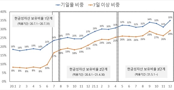 거래기간을 분석했을 때 1일물이 86조 4000억원(68.2%)으로 가장 많았으며 이어 7~10일물이 18조 7000억원(14.8%), 10일 초과물이 14조 4000억원(11.4%) 등의 순으로 많았다. 전년도와 비교하면 전체 거래 중 1일물 비중이 78.1%에서 68.2%로 감소하고 7일 이상의 비중이 13.6%에서 26.2%로 증가했는데 이는 ‘현금성자산 의무보유비율제’에 따른 변화로 분석된다.