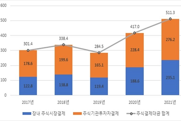 이에 따르면 지난해 장내 주식시장 결제대금은 총 235조 1000억원으로 전년대비 24.7%(46조 5000억원) 증가했다. 또 장외 주식기관 결제대금은 276조 2000억원으로 전년보다 21.0%(47조 8000억원) 늘어난 것으로 나타났다.