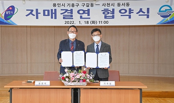 경남 사천시 동서동과 경기 용인시 구갈동이 18일 동서동 행정복지센터 3층 대강당에서 자매결연 협약을 체결했다.
