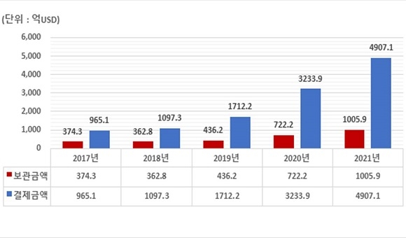 예탁결제원은 ‘2021 외화증권 보관·결제금액 현황조사’ 결과를 20일 발표하고 지난해 결제금액은 4907억 1000만 달러, 보관금액은 1005억 9000만 달러를 기록했다고 밝혔다.