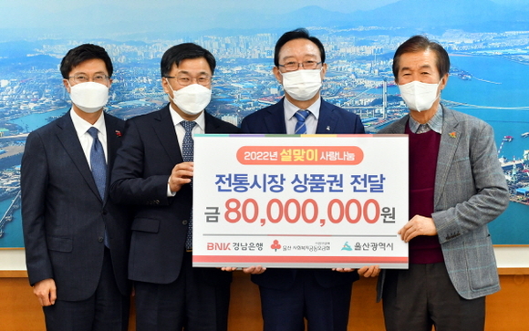 BNK경남은행은 20일 ‘2022년 설 맞이 사랑나눔 활동’의 일환으로 울산광역시에 ‘8000만원 상당 전통시장상품권’을 기탁했다.