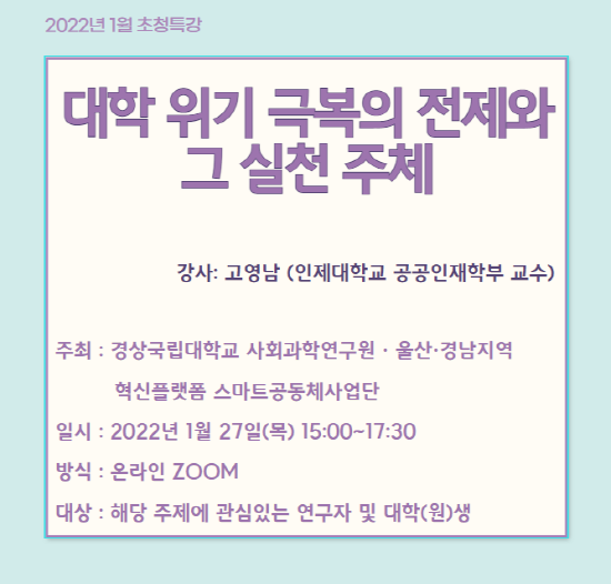 경상국립대학교(GNU) 사회과학연구원과 울산·경남지역혁신플랫폼 스마트공동체사업단은 오는 27일 오후 3시 인제대 공공인재학부 고영남 교수를 초청해 ‘대학 위기 극복의 전제와 그 실천 주체’라는 주제로 초청특강을 개최한다.