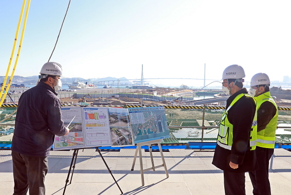 강준석 사장을 비롯한 공사 경영진은 오늘(21일) 부산항 북항 재개발사업 현장 가운데 ’부산역~친수공원~부산항국제여객터미널‘을 잇는 보행 데크 건설현장을 찾아 점검했다.