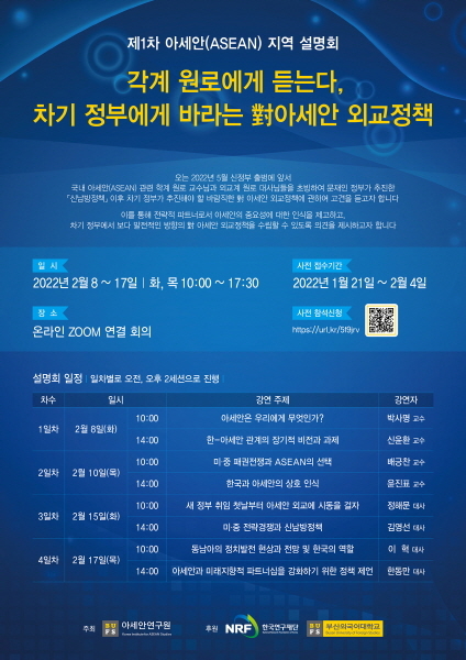 부산외국어대학교 아세안연구원은 오는 2월 8일부터 17일까지 총 4일, 8회에 걸쳐 ‘각계 원로에게 듣는다, 차기 정부에게 바라는 對 아세안 외교정책’을 주제로 제1차 아세안 지역 설명회를 개최한다고 24일 밝혔다.