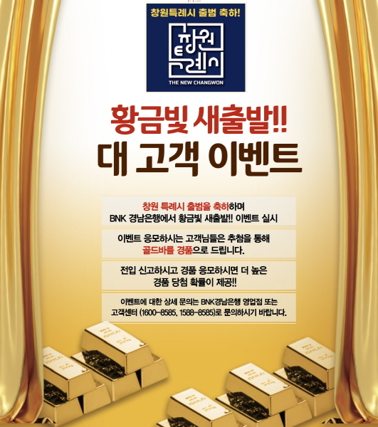 이어 “황금빛 새출발!! 대고객 이벤트는 새출발!! 정기예금 가입 시 거래 실적뿐만 아니라 창원시 전입 신고 여부에 따라 골드바 당첨 확률이 높아진다. 중복 당첨이 가능한 만큼 많은 고객들이 참여했으면 한다”고 덧붙였다.