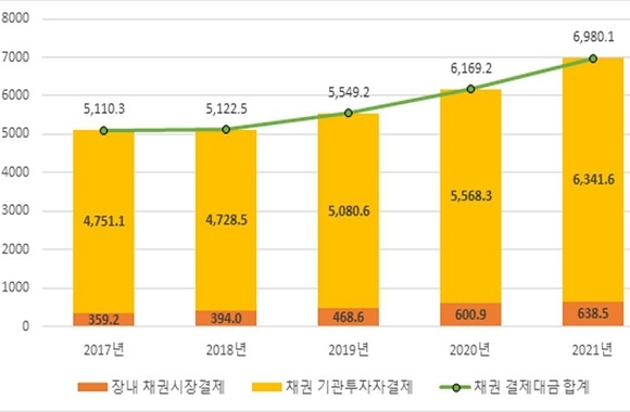 장내 채권시장 결제대금은 638조 5000억원으로 전년대비 6.3%가, 장외 채권 기관투자자 결제대금은 6341조 6000억원으로 전년대비 13.9% 각각 증가했다.