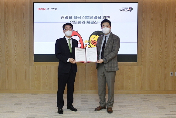 BNK부산은행이 지난 25일 오후 부산은행 본점에서 애니메이션 제작 전문기업 ‘스튜디오 더블유바바㈜’와 ‘캐릭터 콘텐츠 활용 업무협약’을 체결했다고 26일 밝혔다.