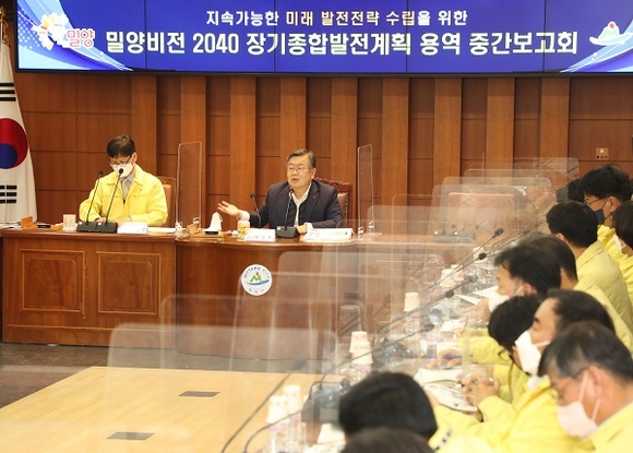 경남 밀양시는 지난 25일 시청 소회의실에서 박일호 시장 주재로 부시장, 국소장 및 전 실과소장이 모두 참석한 가운데 시의 2040년을 내다보는 미래비전과 차별화된 발전전략을 제시하고 미래상을 구현하기 위한 '밀양비전 2040 장기종합발전계획 수립 연구용역' 중간보고회를 가졌다.