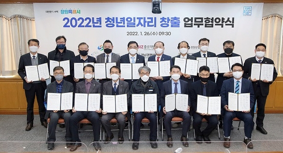 경남 창원시는 26일 오전 시청 시정회의실에서 청년 일자리 창출 사업의 원활한 추진을 위해 16개 기업 및 유관기관과 업무협약을 체결했다.