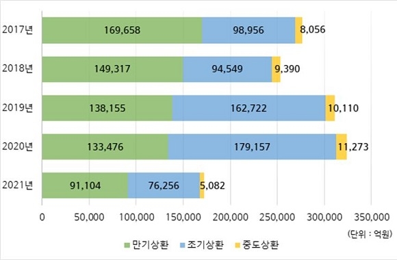 지난해 DLS 상환금액은 17조 2442억원으로 유형별로는 만기상환이 9조 1104억원으로 전체의 52.8%로 가장 많은 비중을 차지했다. 이어 조기상환이 44.2%(7조 6256억원), 중도상환이 2.9%(5082억원)의 비중을 각각 차지했다.