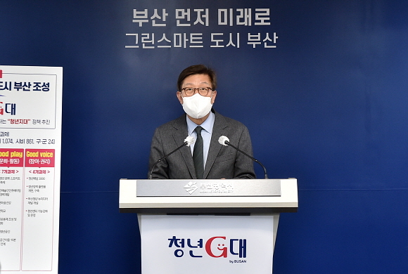 박형준 부산시장이 27일 오후 2시 시청 브리핑실에서 ‘청년G대 정책 구축계획 발표’ 기자회견을 열고 청년의 ‘일자리’ ‘주거’ ‘문화’ ‘권리’ 4대 과제에 총 1959억원을 투입할 예정이라고 밝혔다.