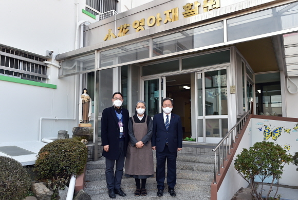 김석준 부산시교육감(우측)이 설 명절을 앞둔 지난 27일 오전, 부산 남구에 위치한 장애아동시설 ‘소화영아재활원’을 찾아 성금을 전달한 가운데 관계자들과 기념촬영하고 있다. 부산시교육청에 따르면 이날 김석준 시교육감은 소화영아재활원을 비롯해 수영구에 위치한 아동복지시설 ‘동산원’도 방문해 시설 관계자들을 격려하며 성금을 전달했다. (사진=부산시교육청 제공)