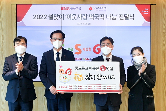 BNK금융그룹이 28일 오전 부산 본사에서 ‘사랑의 떡국 떡 나눔 행사’를 열고 부산사회복지공동모금회에 떡국 떡 3㎏ 1000상자, 총 3000㎏를 기탁했다고 밝혔다.