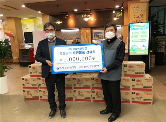 낙동강유역환경청은 설 명절을 맞아 28일 창원 의창구 소재 사회복지시설인 창원시장애인종합복지관을 찾아 식료품을 전달하는 이웃사랑 실천행사를 가졌다. (사진=낙동강청 제공)